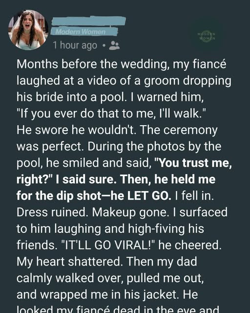 I looked up at the screen. A groom had just dropped his bride into a pool during their wedding photos. Guests screamed. The comments were exploding.